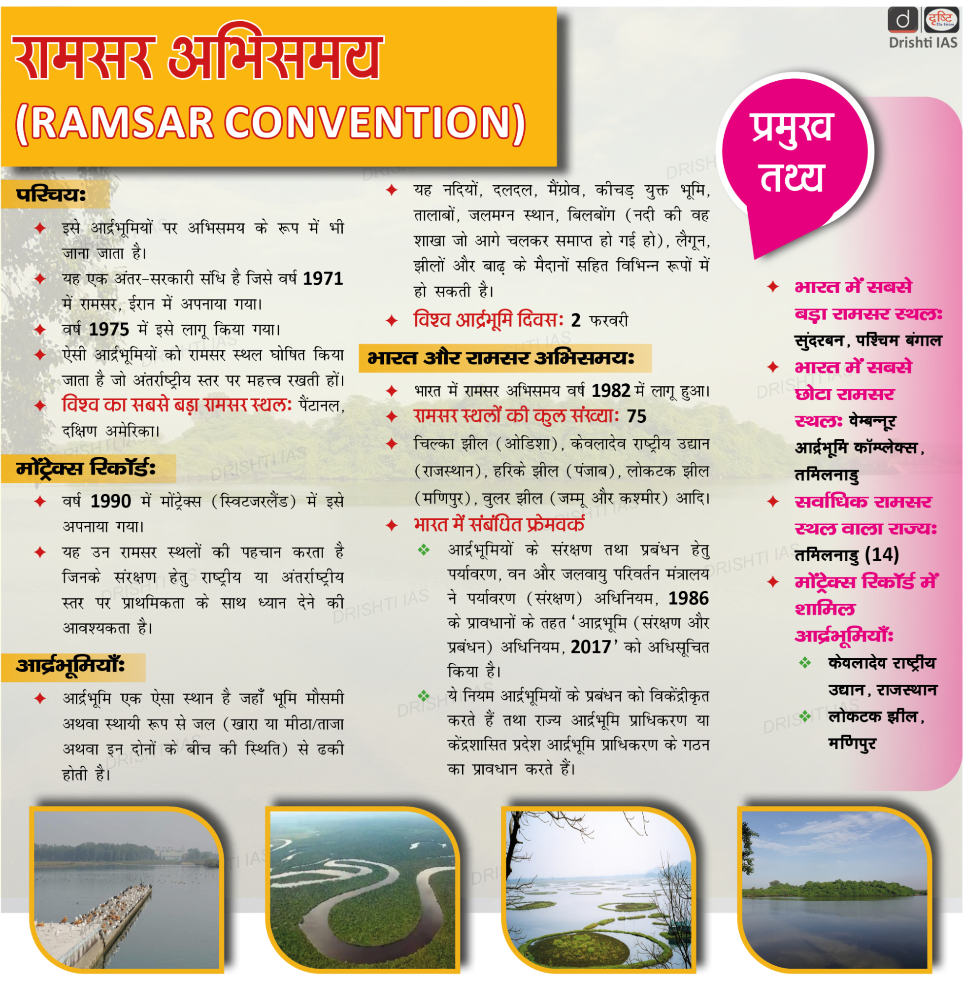 - आर्द्र भूमि (संरक्षण और प्रबंधन) नियम, 2010, भारत सरकार ने रामसर सम्मेलन की संस्तुतियों के आधार पर बनाए थे।