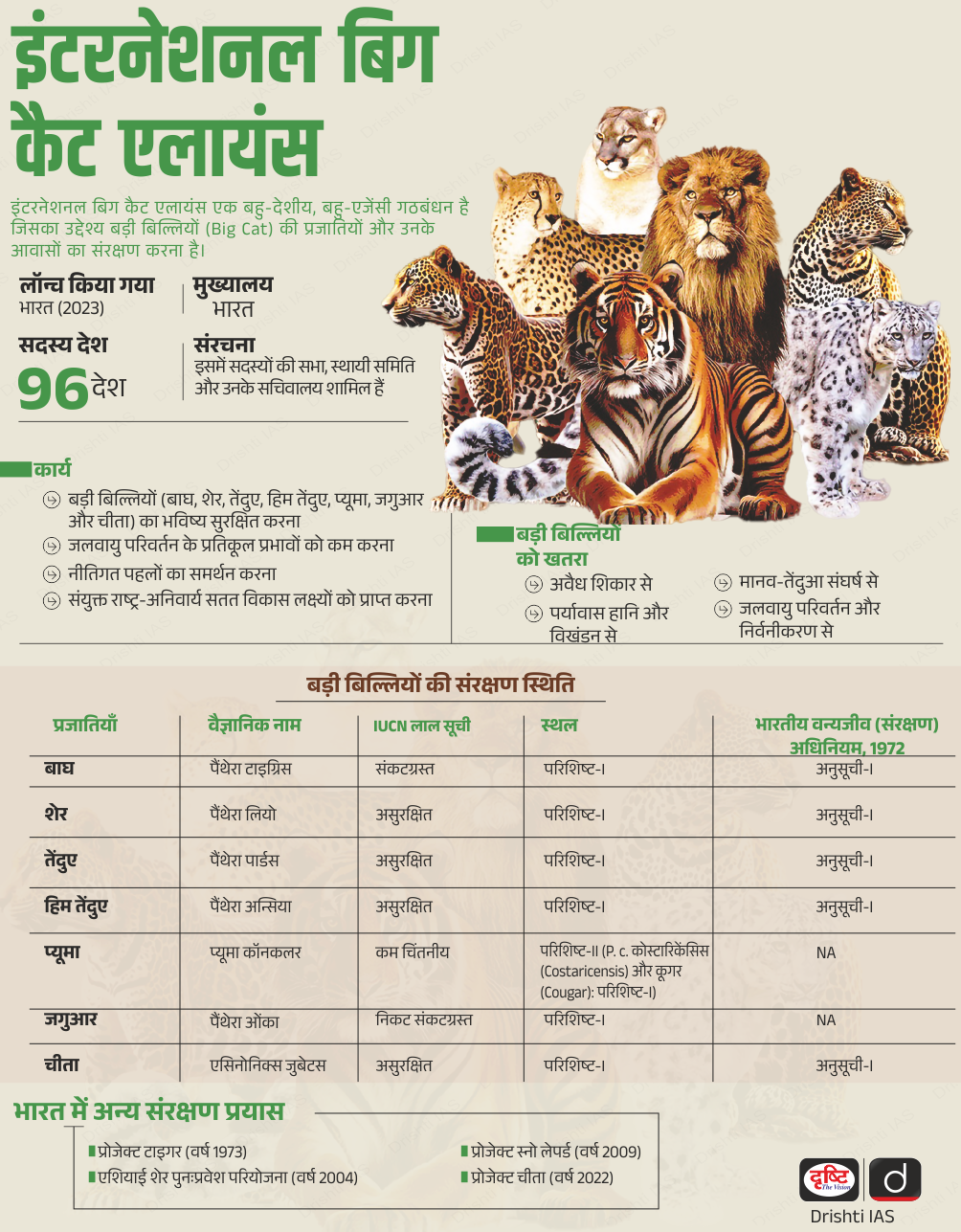 - उद्देश्य: अवैध वन्यजीव व्यापार को रोकना, प्राकृतिक आवासों का संरक्षण करना, वित्तीय और तकनीकी संसाधनों का संकलन करना तथा बिग कैट प्रजातियों पर जलवायु परिवर्तन के प्रभावों को कम करना।