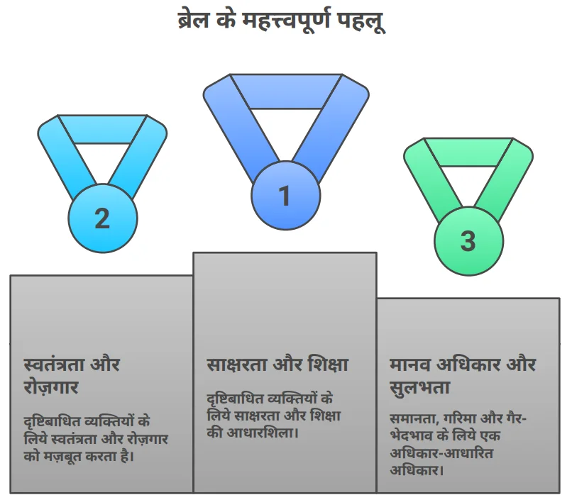 - परिचय: ब्रेल एक स्पर्शजन्य (छूकर लिखने और पढ़ने) लेखन और पठन प्रणाली है, जिसका उपयोग उन लोगों द्वारा किया जाता है जो दृष्टिबाधित हैं या जिनकी दृष्टि कमज़ोर है। यह छह बिंदुओं वाले एक सेल पर आधारित होती है, जिसमें तीन-तीन बिंदुओं की दो पंक्तियाँ होती हैं। उभरे हुए इन बिंदुओं के विभिन्न संयोजन अक्षरों, संख्याओं, विराम चिह्नों और प्रतीकों को दर्शाते हैं, जिससे इसे स्पर्श के माध्यम से पढ़ा जा सकता है।