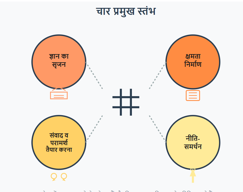 - मुख्य कार्य: यह चार प्रमुख तरीकों से कार्य करता है—ज्ञान का सृजन (knowledge production), क्षमता निर्माण (capacity development), नीति-समर्थन (advocacy) और संवाद व परामर्श तैयार करना (convening dialogues)।