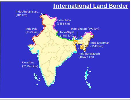 - भारत-म्याँमार सीमा: म्याँमार के साथ भारत की 1,643 किमी. लंबी सीमा अरुणाचल प्रदेश (520 किमी.), नगालैंड (215 किमी.), मणिपुर (398 किमी.) और मिज़ोरम (510 किमी.) से होकर गुज़रती है।