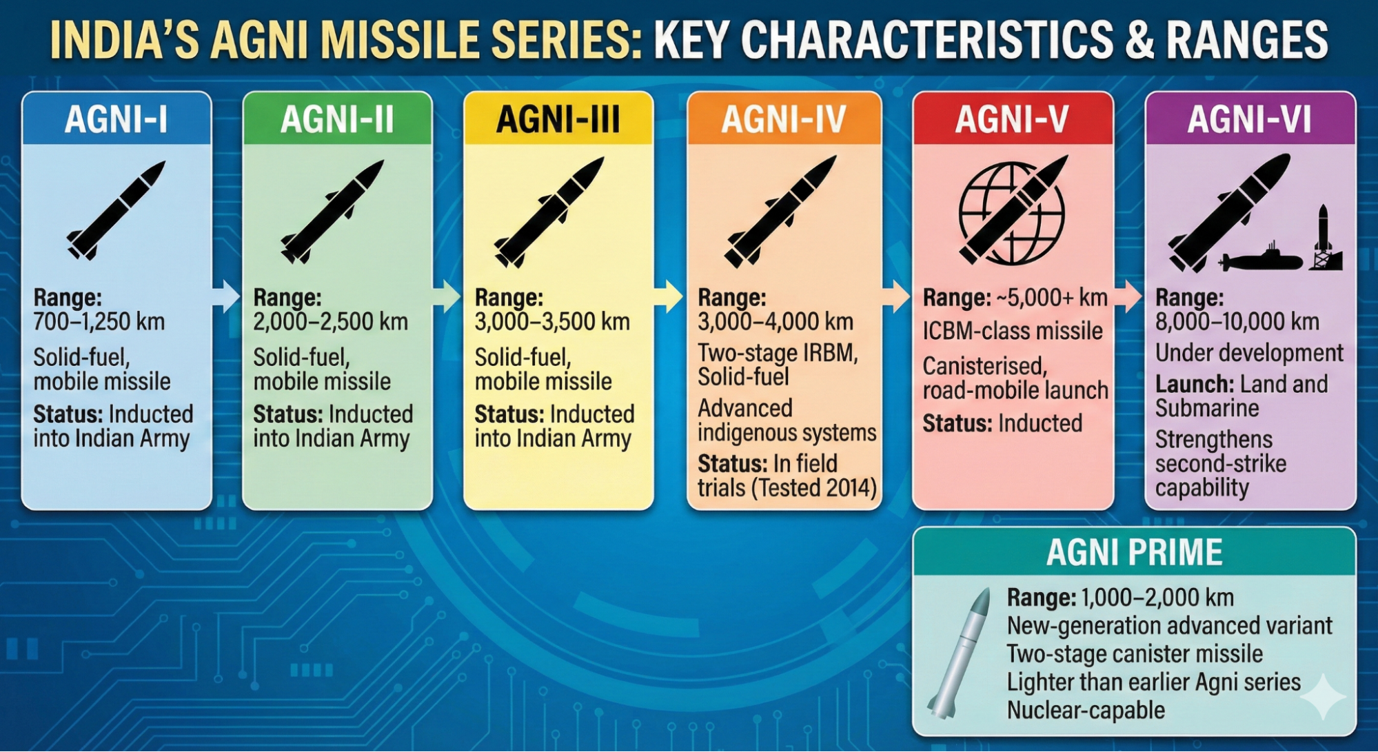 - अग्नि मिसाइल शृंखला, जिसे वर्ष 1980 के दशक में एकीकृत निर्देशित मिसाइल विकास कार्यक्रम (IGMDP) के अंतर्गत परिकल्पित किया गया था, भारत की विश्वसनीय परमाणु प्रतिरोधक क्षमता की आधारशिला है।