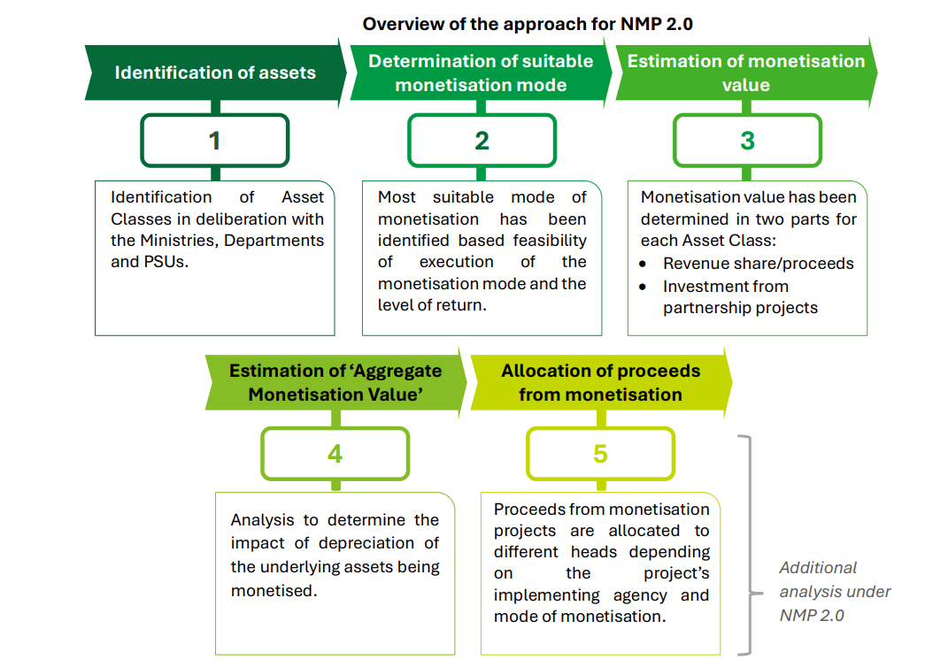- NMP 2.0 "एसेट रिसाइक्लिंग" पर केंद्रित है, जहाँ निजी क्षेत्र की दक्षता का लाभ उठाकर ब्राउनफील्ड एसेट से कैपिटल को फ्री किया जाता है, ताकि सरकार के बजट खर्च को बढ़ाए बगैर नए बुनियादी ढाँचे में निवेश किया जा सके।