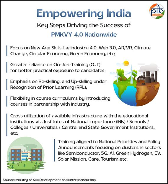 - 15 जुलाई, 2015 को शुरू की गई प्रधानमंत्री कौशल विकास योजना (PMKVY) युवाओं को कौशल प्रमाणन के लिये निःशुल्क, अल्पकालिक प्रशिक्षण और मौद्रिक पुरस्कार प्रदान करके कौशल विकास को बढ़ावा देती है।