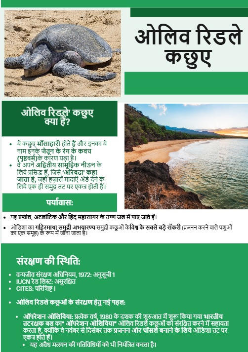 - संरक्षण उपाय: भारतीय तटरक्षक बल द्वारा संचालित 'ऑपरेशन ओलिविया’ के तहत मत्स्य ग्रहण पर प्रतिबंध लागू किया गया है। ओडिशा में टर्टल एक्सक्लूडर डिवाइसेस (TED) अनिवार्य हैं। टैगिंग कार्यक्रम प्रवास पर नज़र रखने में सहायक होते हैं।