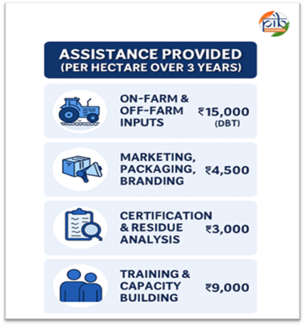 - PKVY के तहत जैविक कृषि को अपनाने वाले किसानों को तीन वर्षों की अवधि में प्रति हेक्टेयर ₹31,500 की सहायता प्रदान किया जाना शामिल है।