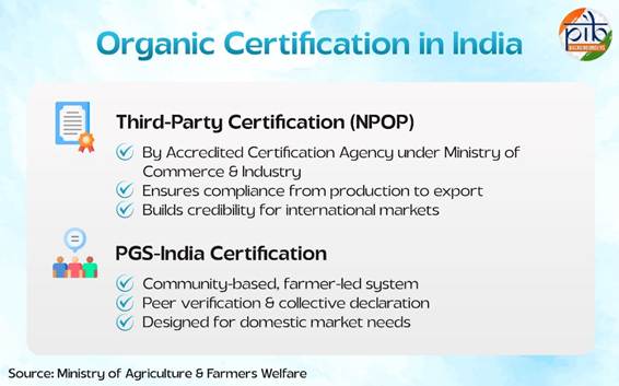 - तृतीय-पक्ष प्रमाणन (NPOP): राष्ट्रीय जैविक उत्पादन कार्यक्रम (NPOP) के अंतर्गत मान्यता प्राप्त एजेंसियों द्वारा प्रबंधित, यह प्रणाली उत्पादन, प्रसंस्करण, व्यापार और निर्यात में अंतर्राष्ट्रीय मानकों का अनुपालन सुनिश्चित करती है, जिससे भारतीय किसानों को वैश्विक जैविक बाज़ारों तक पहुँच प्राप्त करने में सहायता मिलती है।