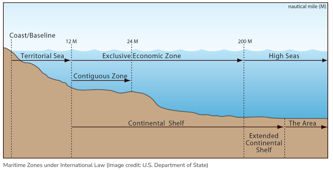 - परिचय: “EEZ” (विशिष्ट आर्थिक क्षेत्र) समुद्र का वह क्षेत्र होता है जो आमतौर पर किसी देश के प्रादेशिक समुद्री क्षेत्र (Territorial Sea) से आगे 200 नॉटिकल मील (लगभग 230 मील) तक फैला होता है। इस क्षेत्र के भीतर तटीय राष्ट्र को जीवित (जैसे मछलियाँ) और अजीवित (जैसे- तेल, गैस, खनिज) दोनों प्रकार के समुद्री संसाधनों पर अधिकार तथा न्यायिक अधिकार प्राप्त होते है।