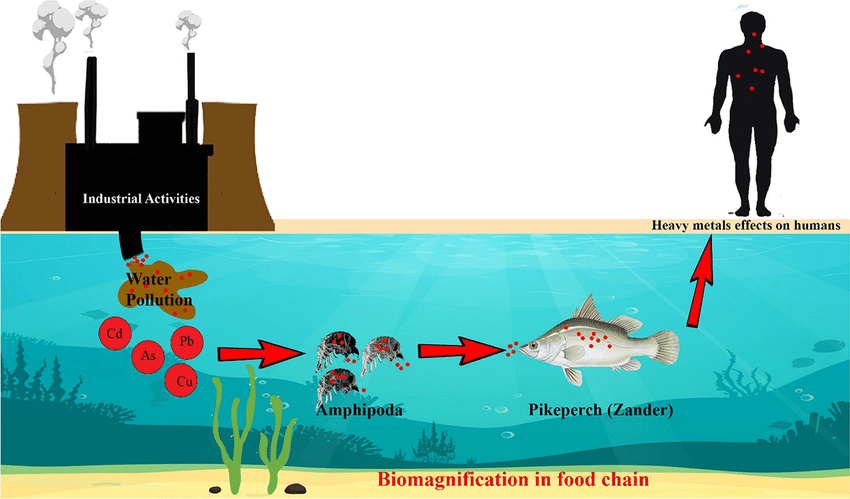 - एक प्रमुख उदाहरण है जलीय प्रणाली में मिथाइलमर्करी (Methylmercury)। औद्योगिक प्रदूषण से उत्पन्न अकार्बनिक पारा जलीय वातावरण में मिथाइलमर्करी में परिवर्तित हो जाता है, जो मछलियों और शेलफिश में जमा हो जाता है।