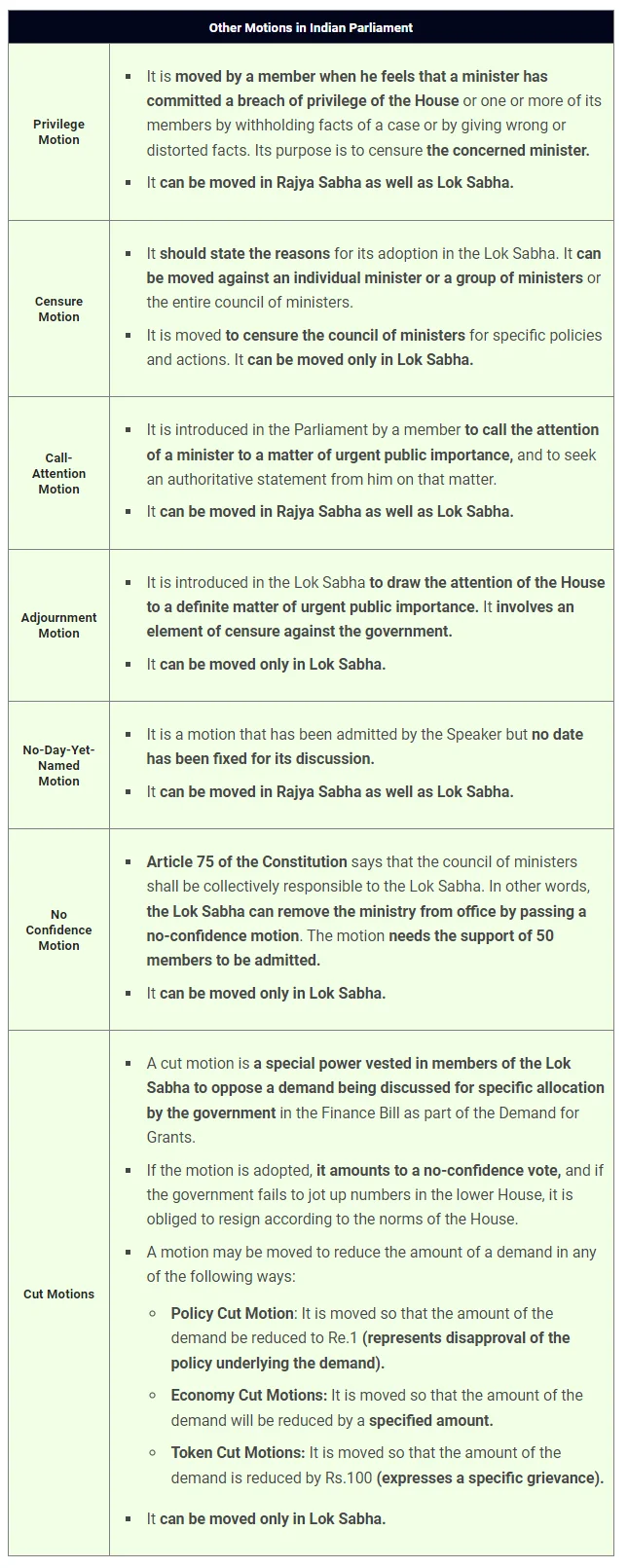 - प्रस्ताव ही संसद में सभी चर्चाओं एवं निर्णयों का बुनियादी आधार है।