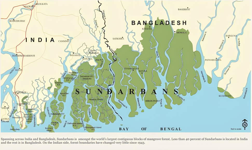 - भौगोलिक स्थिति: सुंदरबन दुनिया का सबसे बड़ा सतत मैंग्रोव वन है, जो गंगा, ब्रह्मपुत्र और मेघना नदियों के डेल्टा पर बंगाल की खाड़ी में गिरने वाला है।