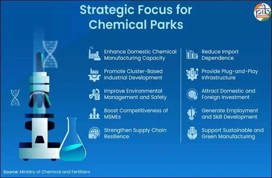 - परिचय: केमिकल पार्क्स विशेष रूप से रसायन तथा पेट्रोकेमिकल विनिर्माण के लिये विकसित योजनाबद्ध औद्योगिक क्लस्टर होते हैं, जहाँ अनेक इकाइयाँ साझा अवसंरचना एवं सामान्य सुविधाओं का उपयोग करते हुए एक साथ संचालित होती हैं।