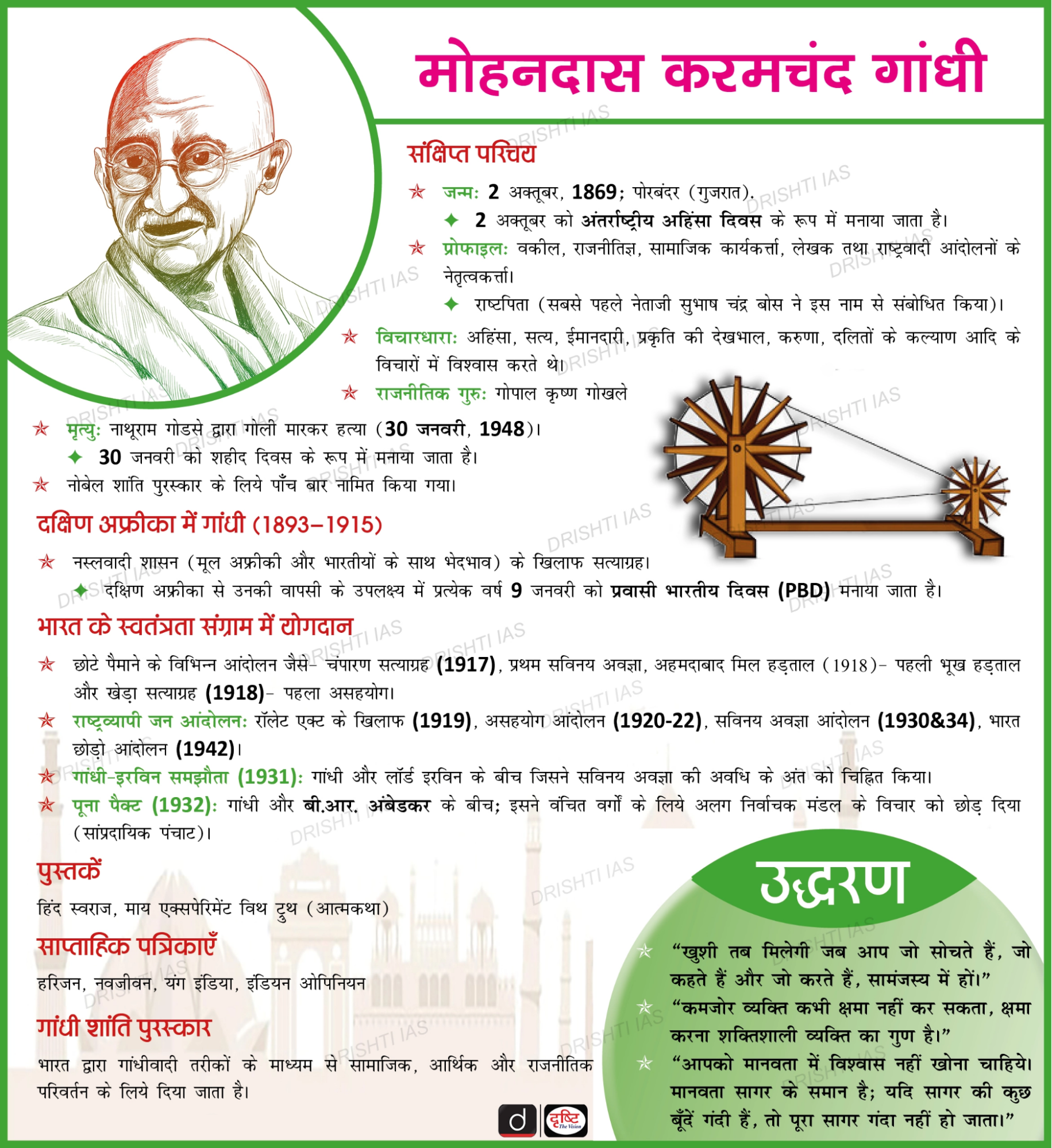 - जन्म: महात्मा गांधी का जन्म 2 अक्तूबर, 1869 को पोरबंदर (गुजरात) में हुआ था।