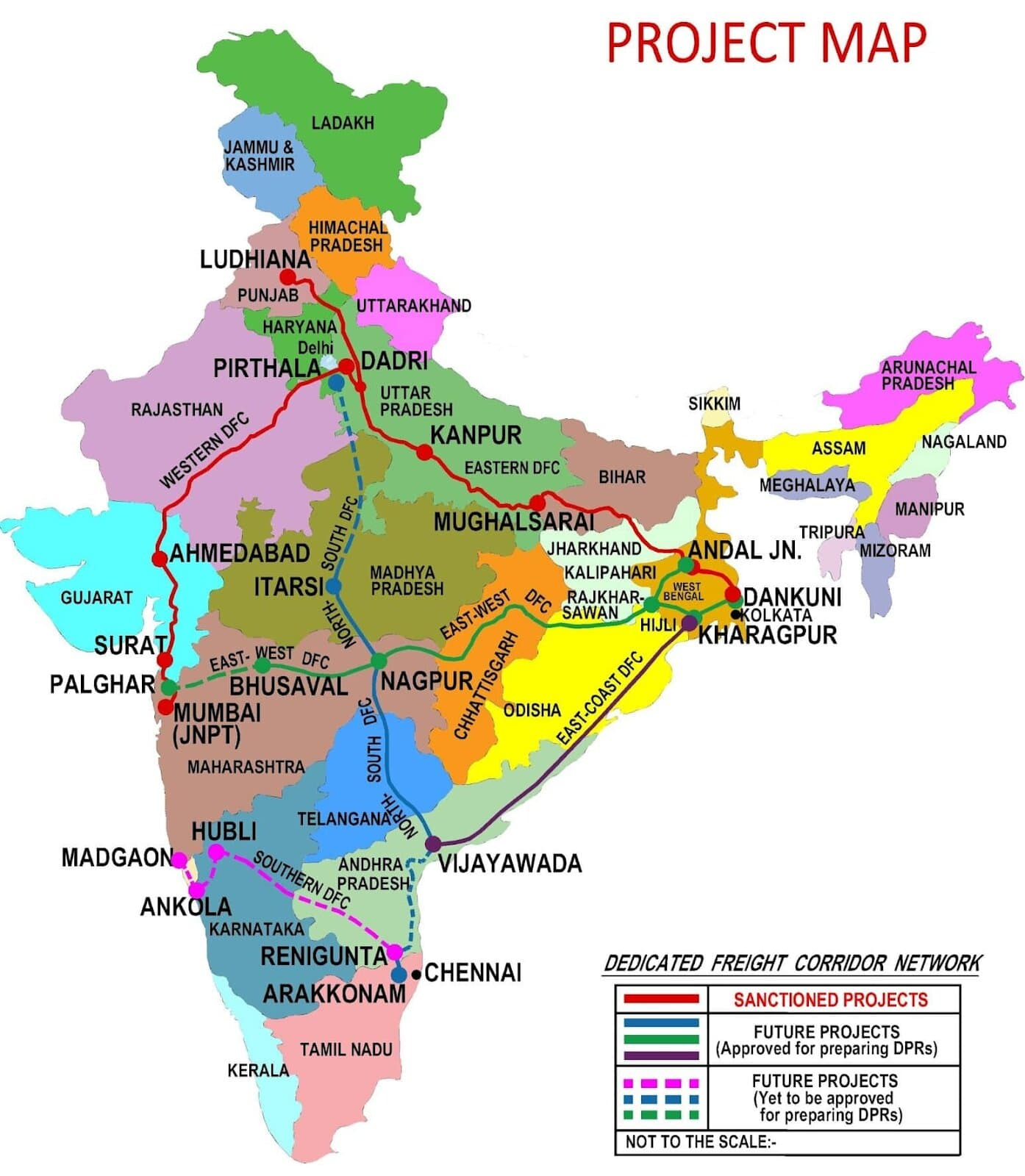 - वेस्टर्न DFC (WDFC): यह जवाहरलाल नेहरू पोर्ट टर्मिनल (JNPT), मुंबई से दादरी तक लगभग 1,506 किमी लंबा है।। WDFC का वित्तपोषण जापान अंतर्राष्ट्रीय सहयोग एजेंसी (JICA) द्वारा किया जा रहा है।