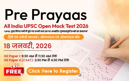 विशिष्ट रूप से निर्मित Pre Prayaas Open Mock Tests के माध्यम से हमारा प्रयास UPSC प्रारंभिक परीक्षा के लिये अभ्यर्थियों को केंद्रित एवं परीक्षा-उन्मुख अभ्यास प्रदान करना है। इन मॉक टेस्टों की संरचना और प्रारूप को यथासंभव वास्तविक UPSC प्रारंभिक परीक्षा के समान रखा गया है, जिससे अभ्यर्थी अपनी वर्तमान तैयारी के स्तर का वस्तुनिष्ठ आकलन कर सकें तथा वास्तविक परीक्षा की प्रकृति, दबाव एवं अपेक्षाओं से भली-भाँति परिचित हो सकें।