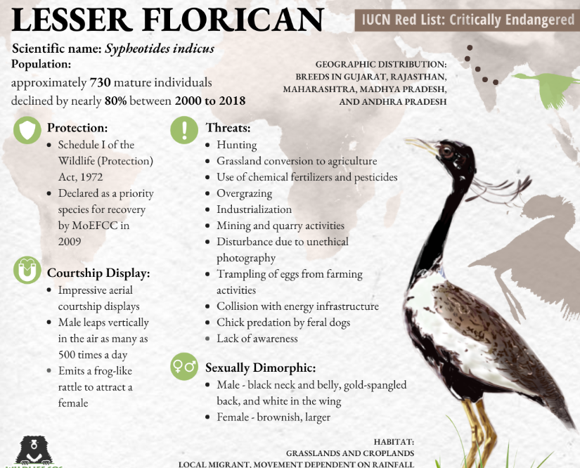 - It is one of three bustard species endemic to India, the others being the Bengal florican (Critically Endangered) and the Great Indian Bustard (Critically Endangered).