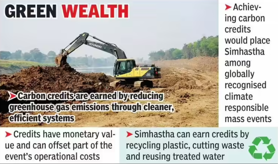 - Carbon Credit Focus: The Simhastha administration is reviewing proposals on carbon accounting, waste-to-resource systems, plastic recycling technologies, and river purification to earn carbon credits.