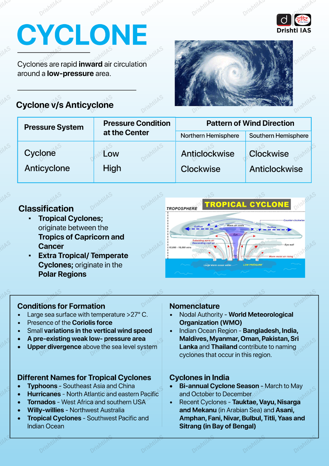 - Definition: Cyclones are fast air circulations around low-pressure areas, rotating anticlockwise in the Northern Hemisphere and clockwise in the Southern, often causing storms and severe weather.